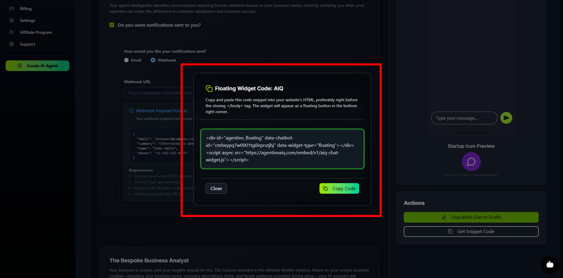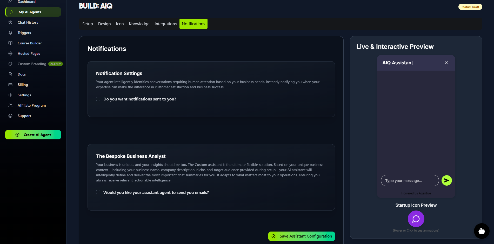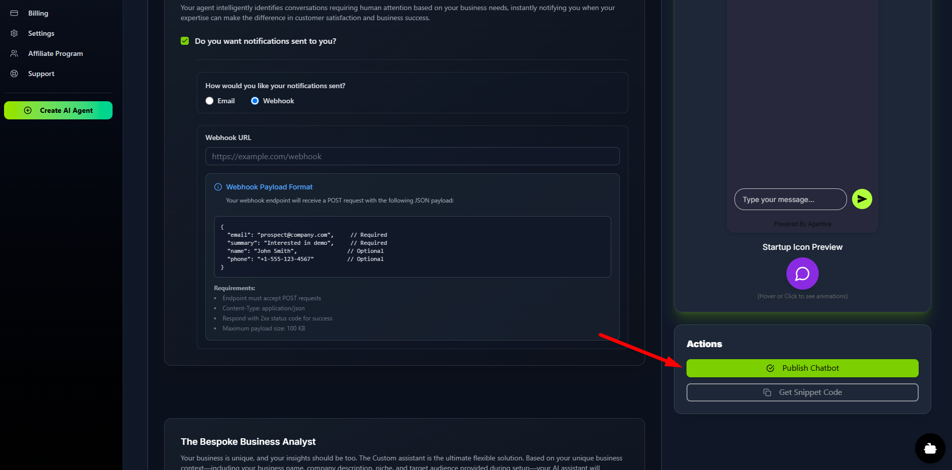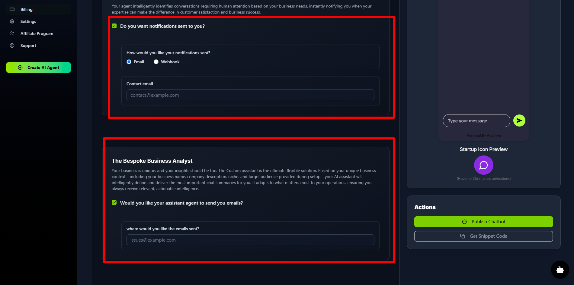 The Bespoke Business Analyst (Assistant Agent): This section is for the powerful background AI. When you enable this, your Assistant Agent will analyze completed conversations, identify key insights, and send detailed summary emails to the address you provide.