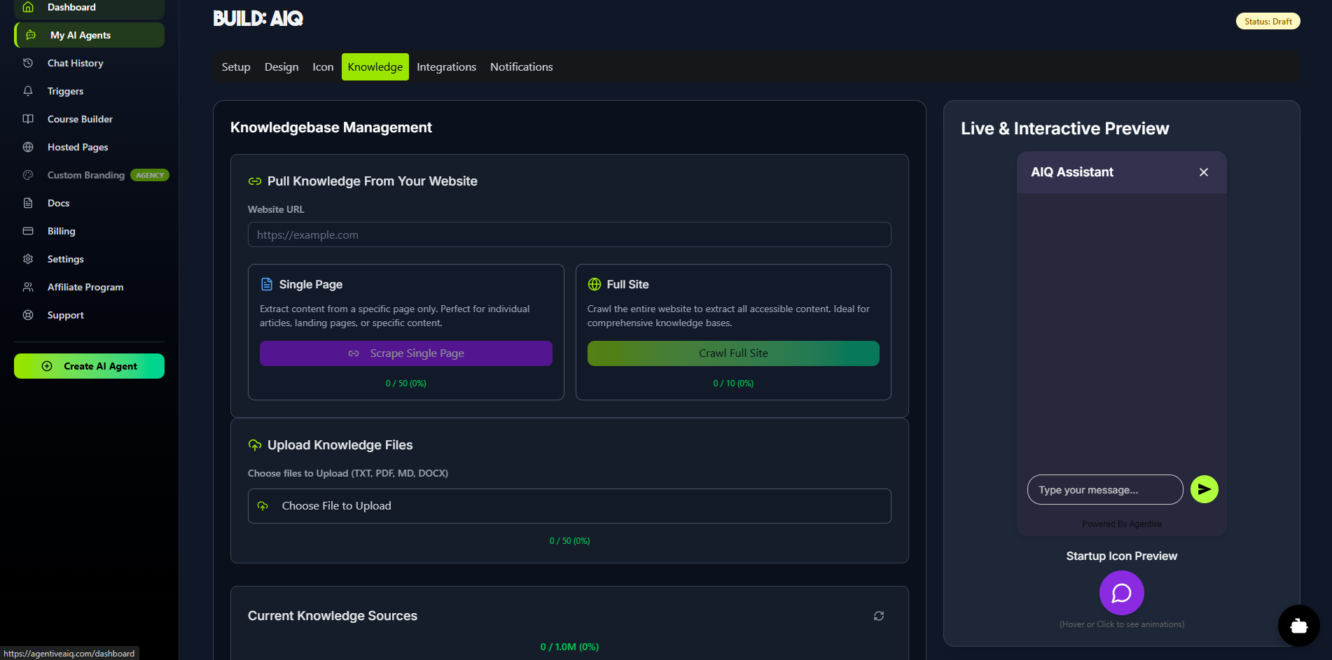 The Knowledge tab is where you build your agent's brain. This is the information your agent will use to provide accurate, in-context answers. You can add knowledge by: