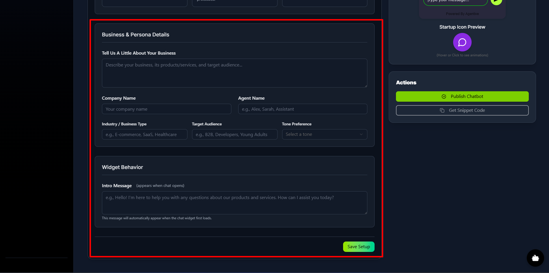 This information is vital—it's pulled directly into the agent's core prompts to give it a unique personality, make it smarter, and align it with your brand's voice. In this section, you will also set the Intro Message, which is the first message a user sees when they open the chat widget.