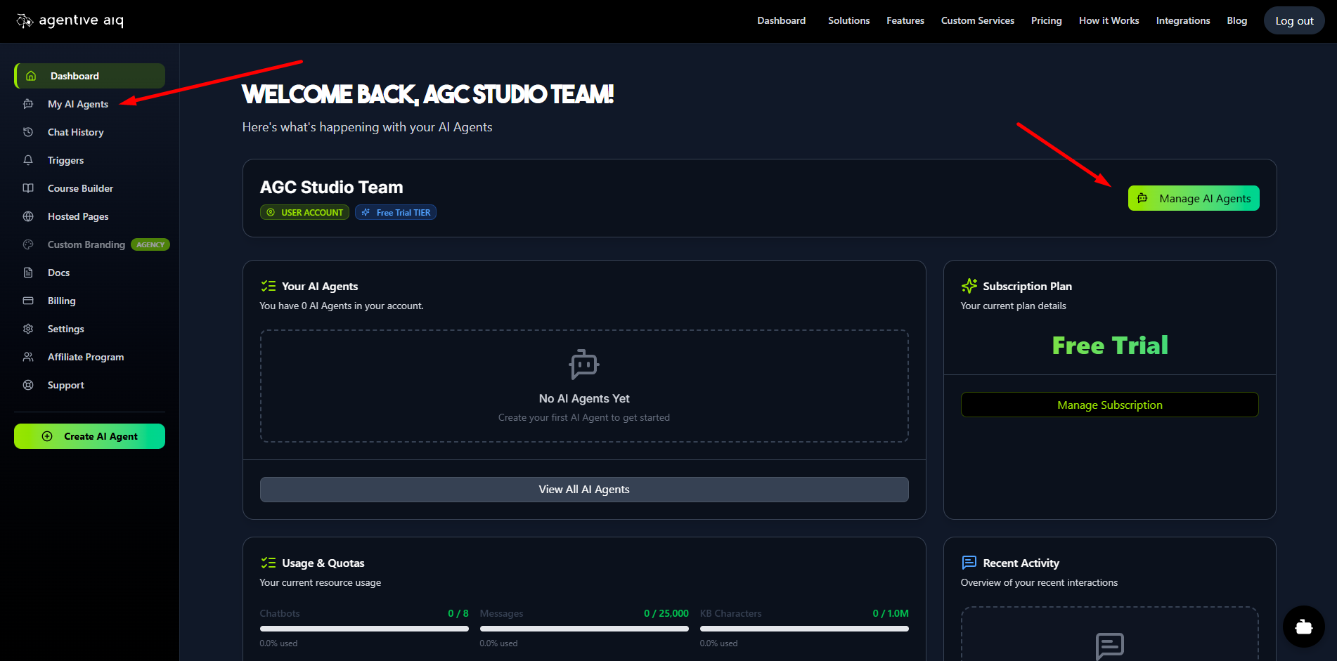 Welcome to your AgentiveAIQ Dashboard. This is your command center where you'll land upon logging in. From here, you can create new agents, monitor your account's usage and quotas, view your subscription plan, and get a quick overview of your recent chat activity.