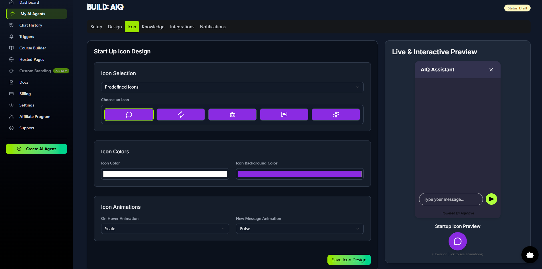 If you selected the Floating Widget deployment type, the Icon tab will be available. This section allows you to customize the launcher icon that users will click to open the chat. You can choose from predefined icons, set the icon and background colors, and select animations for hover-over and new message alerts.