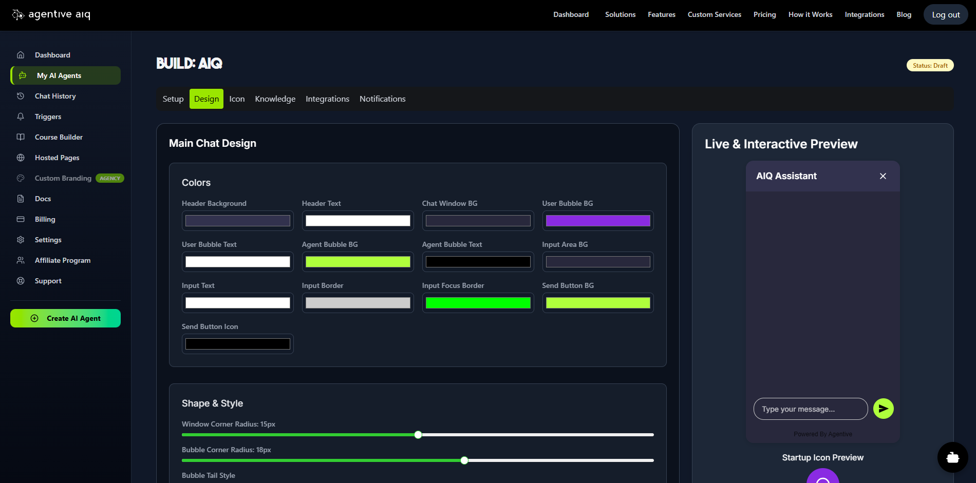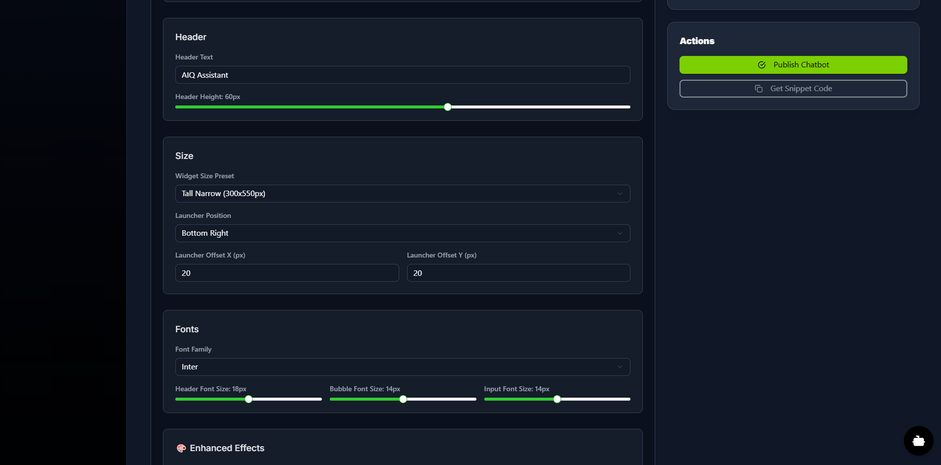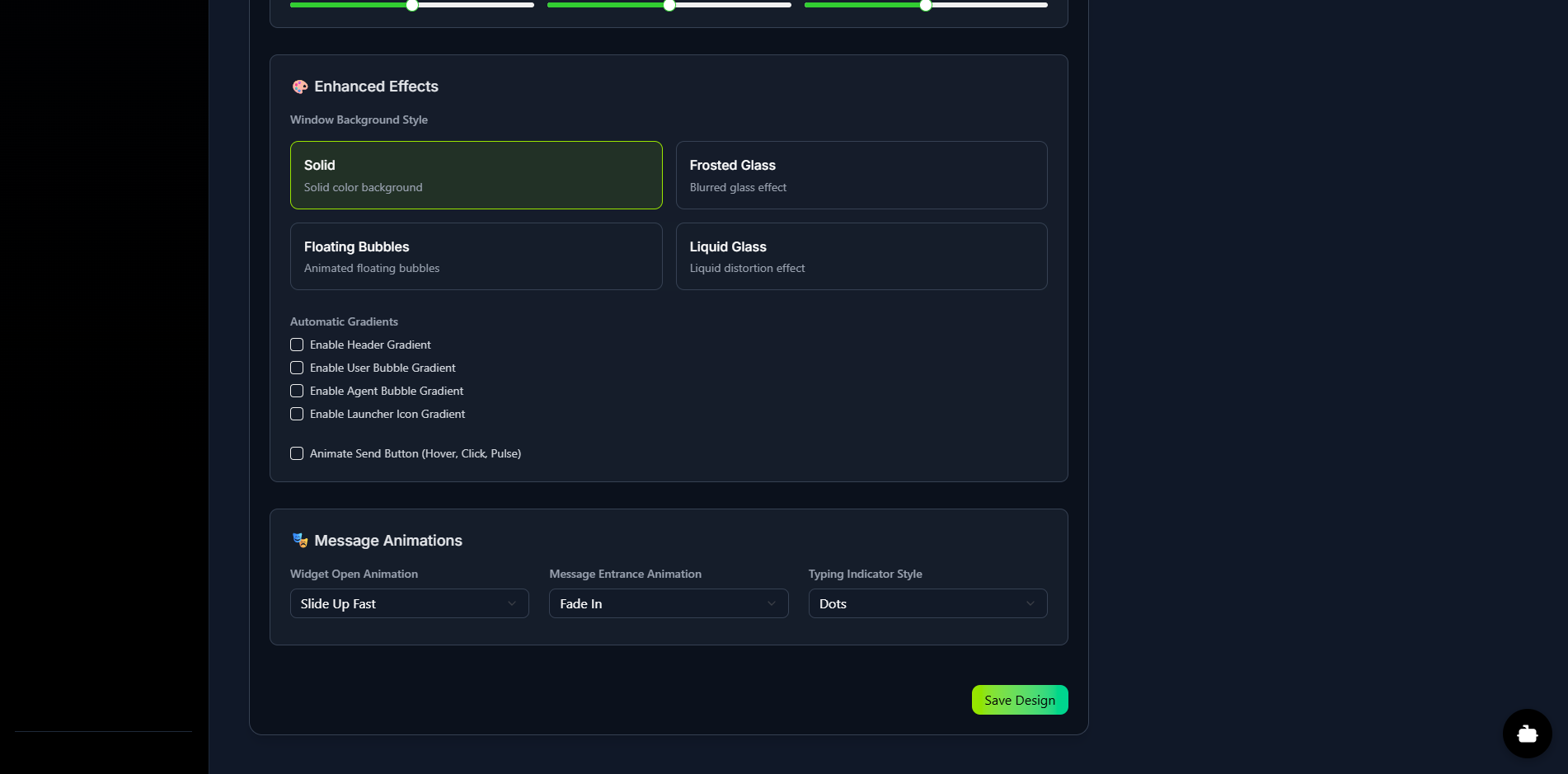 The Design tab is your true WYSIWYG (What-You-See-Is-What-You-Get) editor for full visual customization. As you adjust settings for Colors, Shape & Style, Header, Size, Fonts, Enhanced Effects, and Animations, you will see your changes instantly in the Live & Interactive Preview pane. This allows you to craft a chat widget that perfectly matches your brand's look and feel.