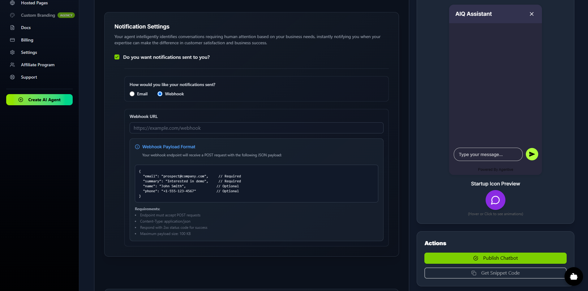 Notification Settings (Main Agent): This top section is for real-time alerts from your user-facing agent. When enabled, the agent will instantly notify you when it achieves its goal (e.g., capturing a new lead). You can choose to receive these alerts via: