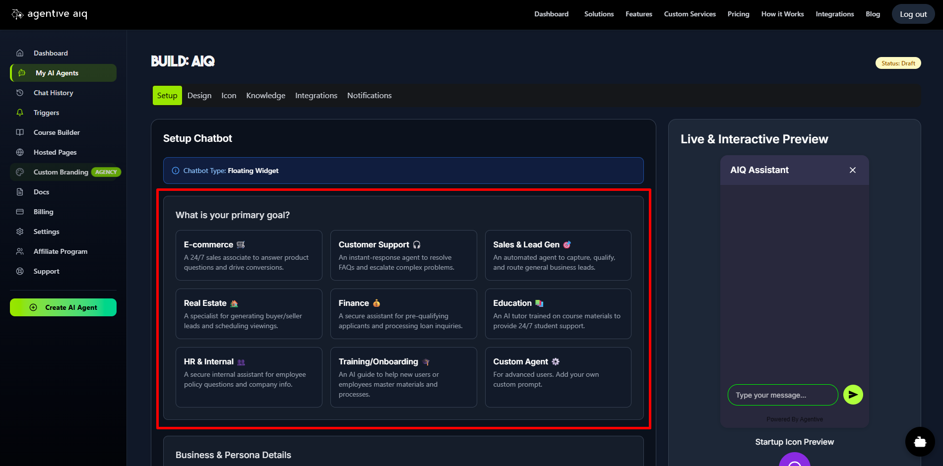 This is a crucial step. Select one of the nine pre-built goals that best suits your needs. Our platform uses dynamic prompt engineering to perfectly train your agent for its specific role. Based on your selection, new conditional fields may appear to further specialize your agent (e.g., setting an outcome goal for 'Sales & Lead Gen' or specifying a market area for 'Real Estate').