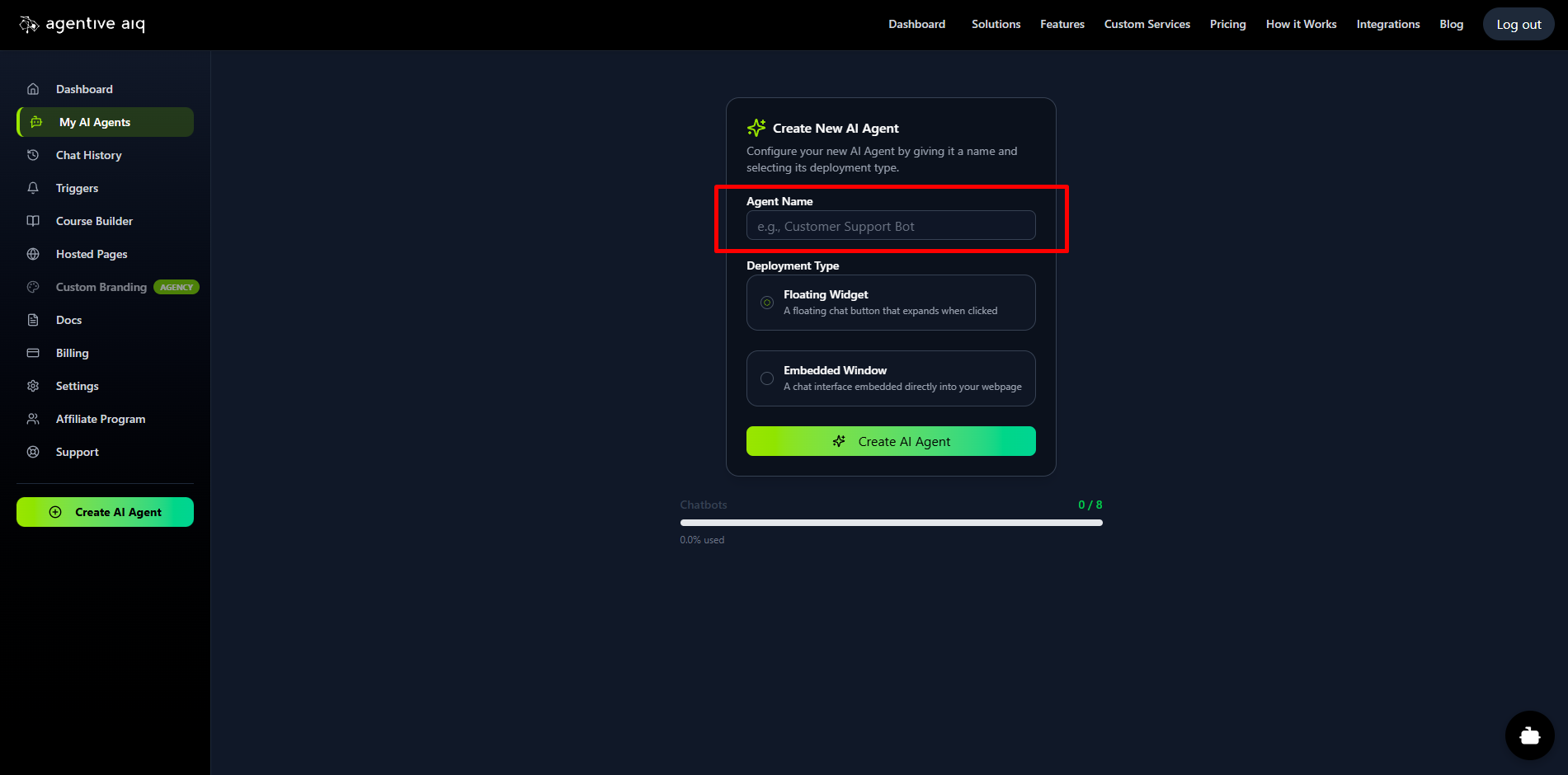 First, give your new agent a name (e.g., "Sales Agent" or "Customer Support Bot"). Next, choose its Deployment Type. You can select: