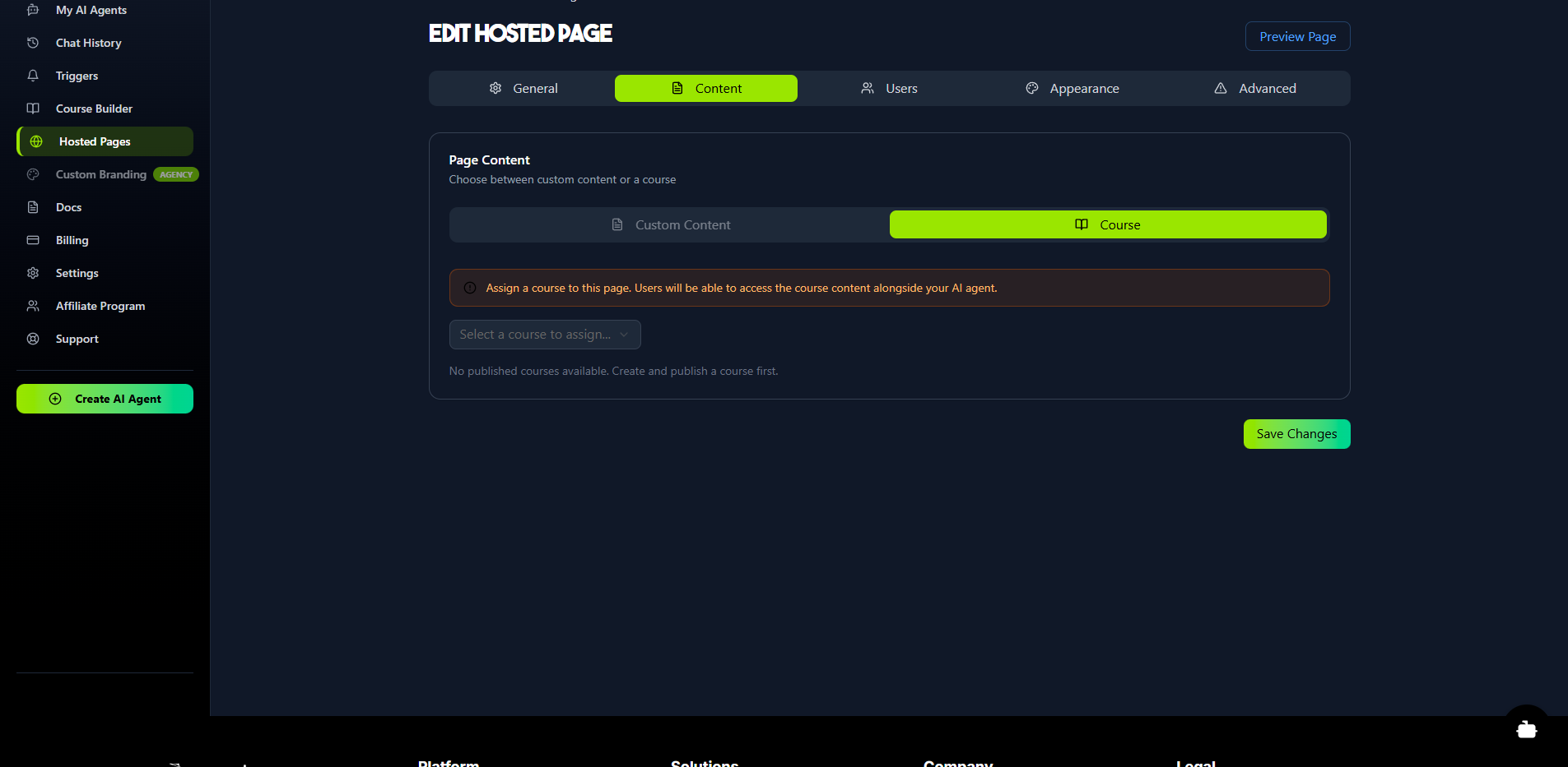 The Course Builder allows you to create comprehensive, multi-media courses. The true power of this feature is unlocked when you connect your course to a Hosted Page. When you do, the AI agent on that page is automatically trained on all your course content—including text, videos, and audio—to act as a 24/7, personalized AI tutor for each of your students.