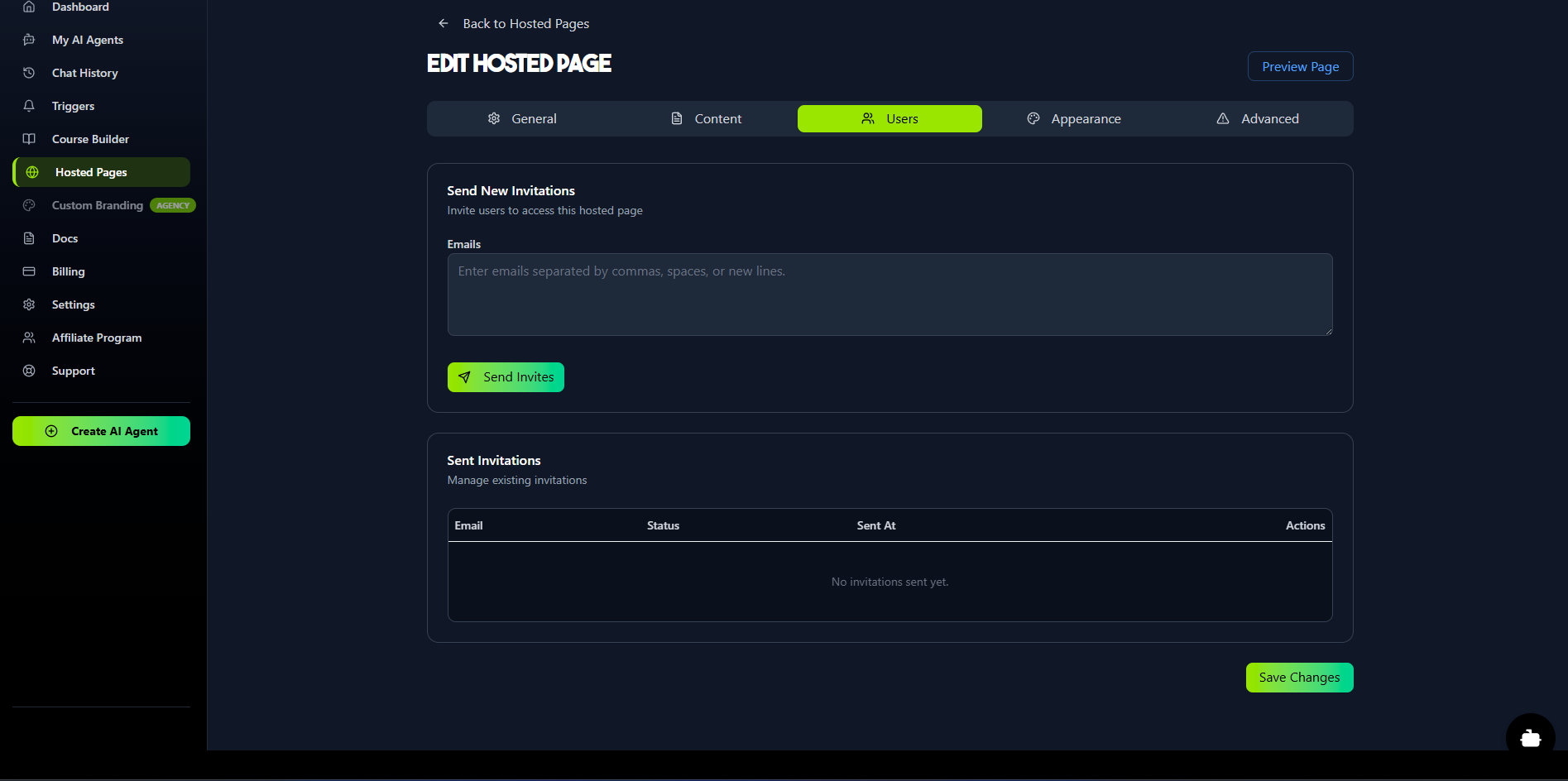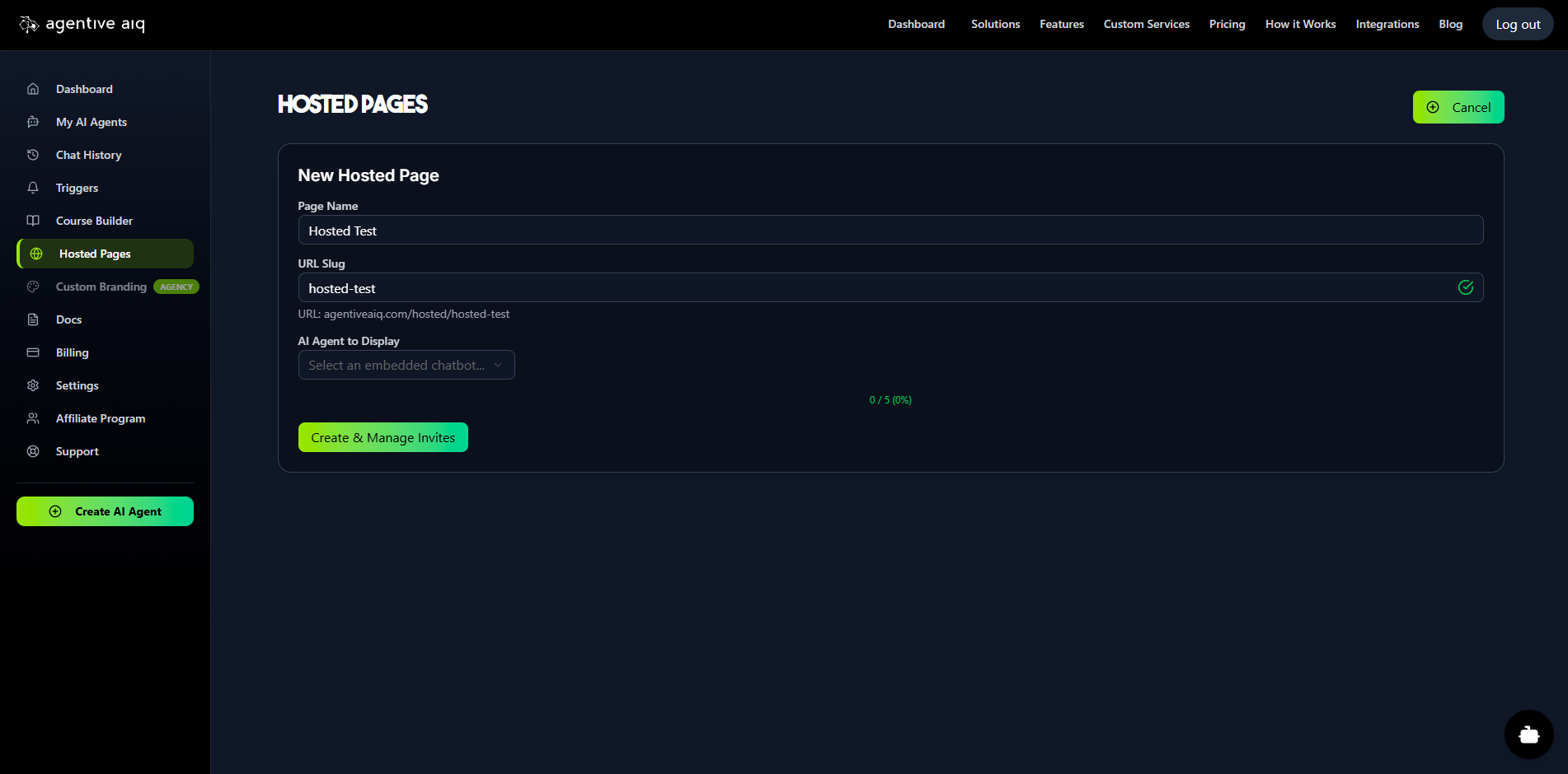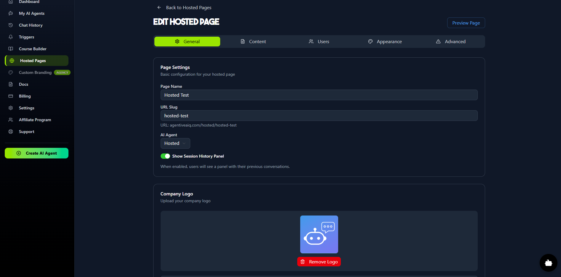 Hosted Pages are secure, brandable, standalone web pages that you can share with your users. They are perfect for internal company knowledge bases, secure client portals, or as an AI-powered educational tutor system. These pages are "gated," meaning users must be invited and log in to access them. This secure environment enables long-term memory for each user, allowing the AI agent to remember and reference all previous conversations. Prerequisite: Before you can create a Hosted Page, you must first build an AI agent and select Embedded Window as its Deployment Type.