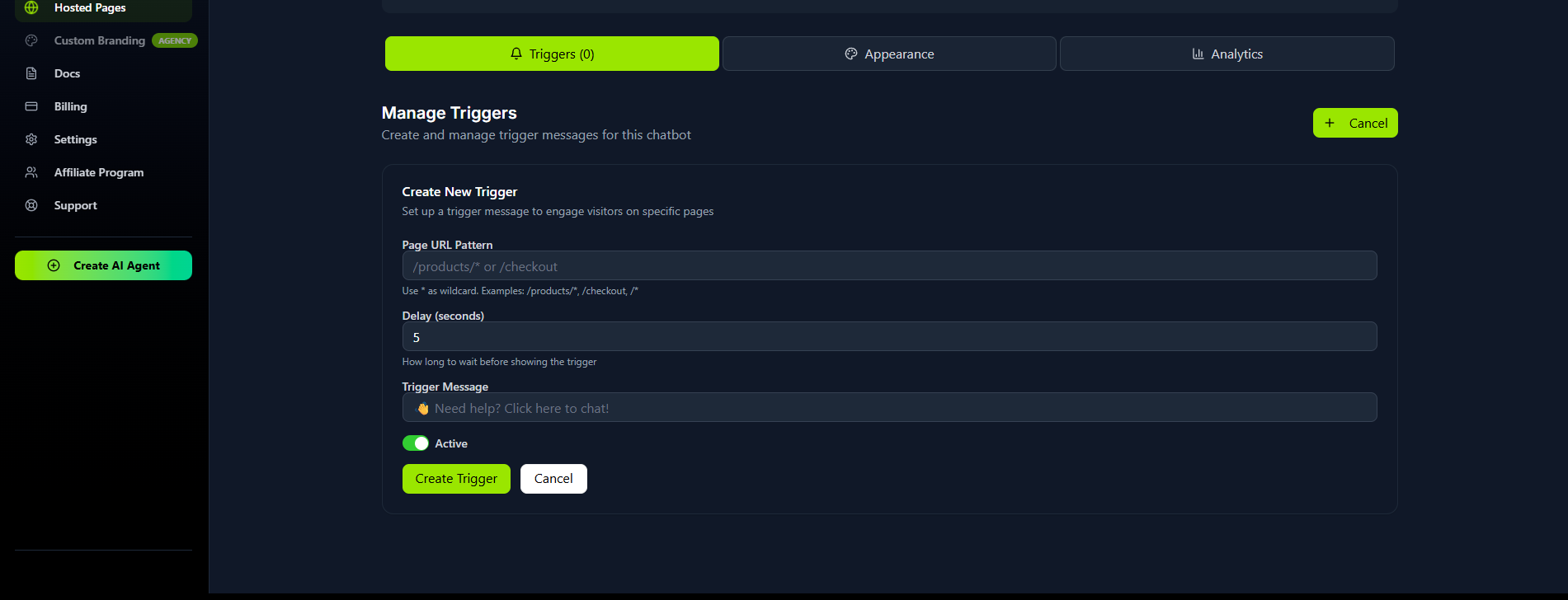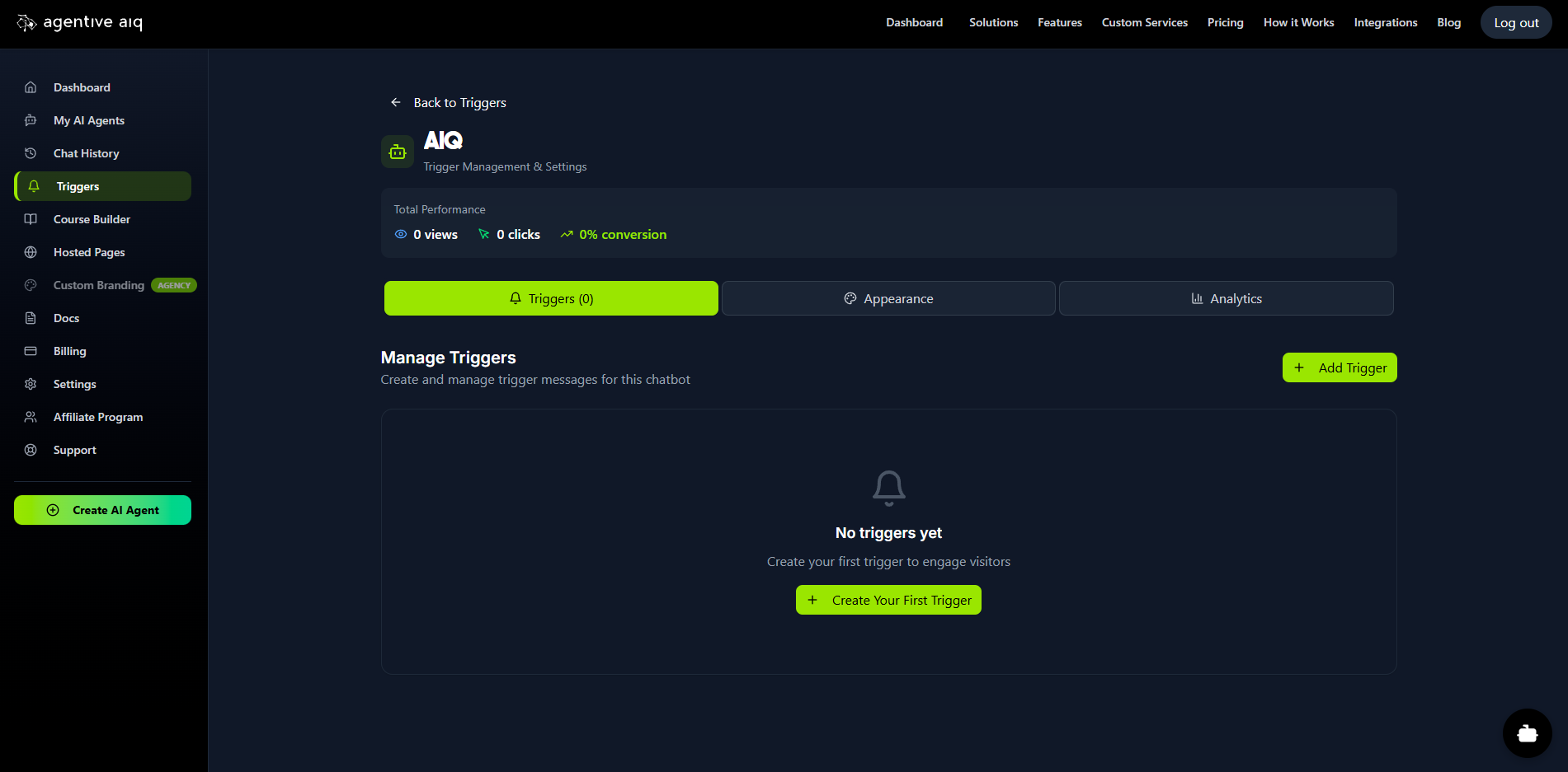 You are now in the management hub for that specific agent. This area has three tabs: Triggers, Appearance, and Analytics.