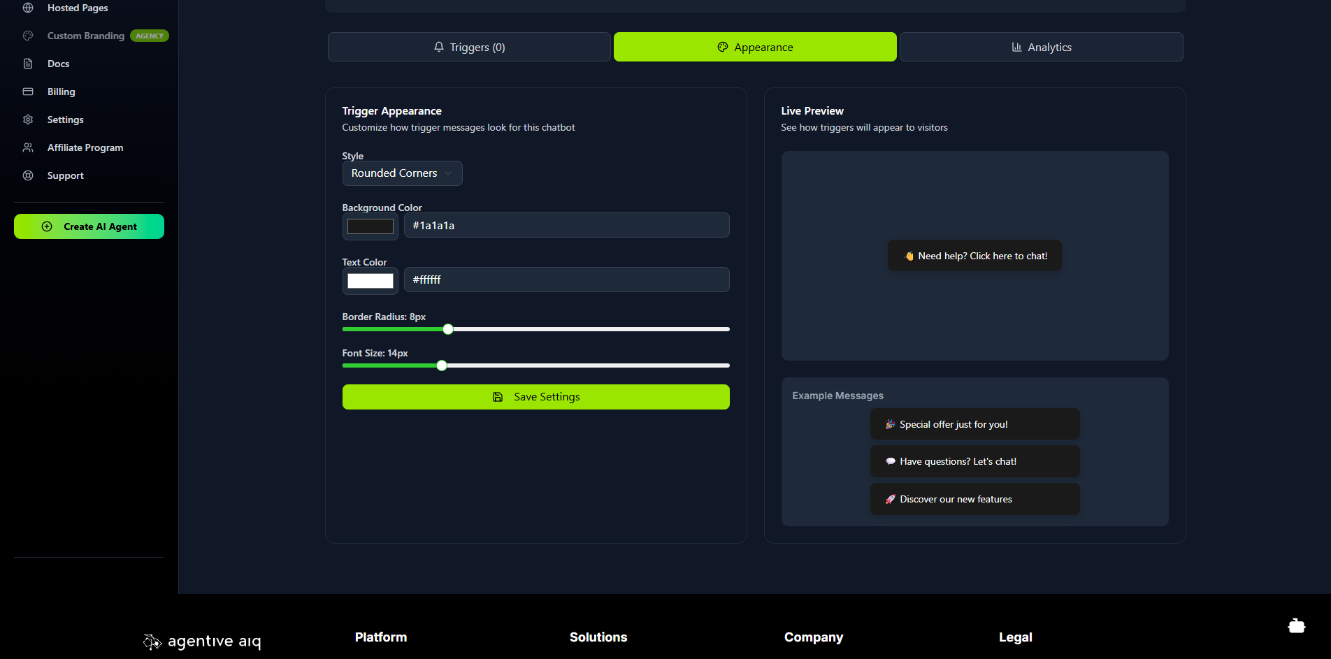 Click the Appearance tab to control the look and feel of all triggers for this agent. You can customize the style, background and text colors, border radius, and font size. The Live Preview pane on the right will show you exactly how your triggers will appear to visitors.